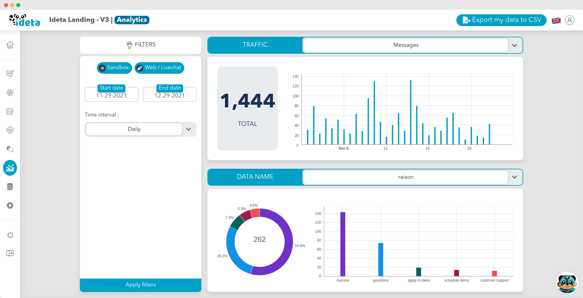 Once you’ve implemented a chatbot into your business, you can generate a global report which tells you how your chatbot is being used by customers, what requests are more frequent, etc.